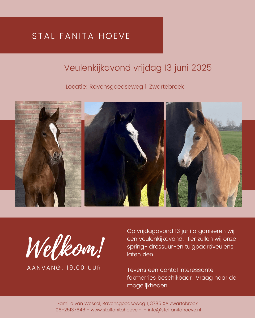 Op 13 juni houden wij onze veulenkijkavond. De aanvang is 19.00 uur. Tevens hebben wij een aantal interessante fokmerries beschikbaar. Vraag naar de mogelijkheden.